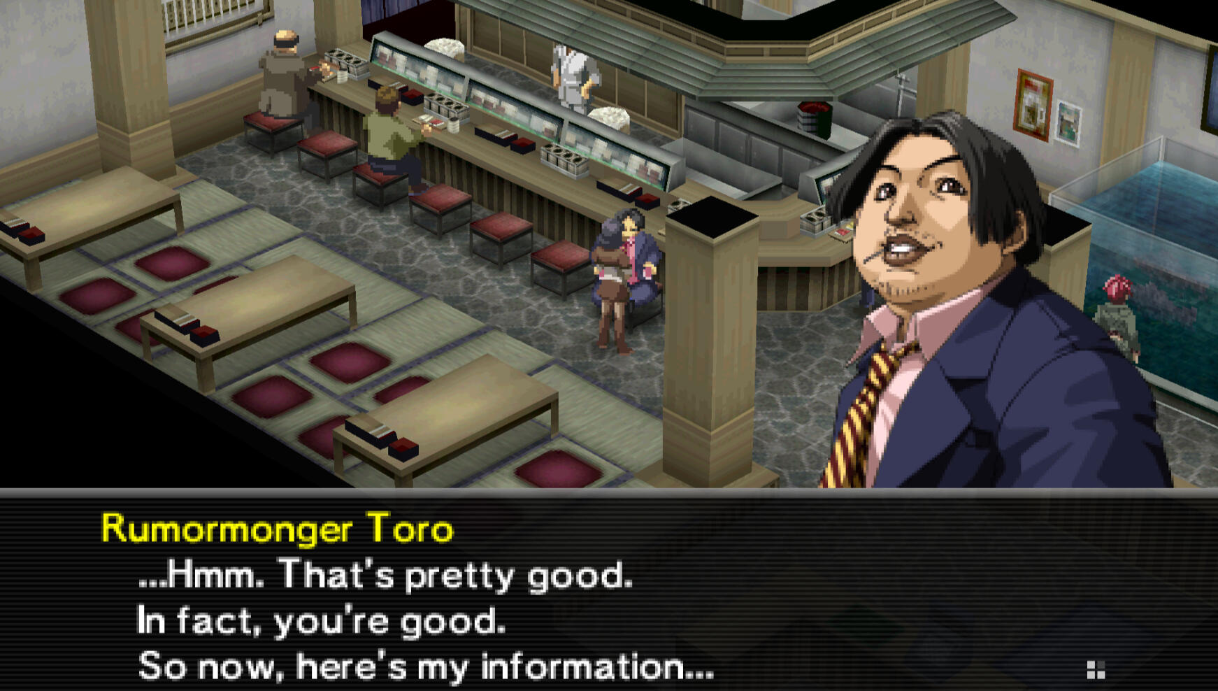 This is the Rengedai Town Map. There are NPCs here to talk to, and if you hold down ▢ you can see all interactable locations. If you need healing, you can head to Lotus > Kaori and heal up with aromatherapy. Speak to everyone you wish if you'd like, but when you are ready, you're going to head to the edge of Rengedai to get to the Sumaru City Map.You only have two locations so far: Rengedai, and Aoba. Obviously, head to Aoba. You'll want to head to Aoba Way > Kuzunoha Detective Agency to advance the plot. After the cutscene, spread the only available rumor with Chief Todoroki, and another short cutscene will play. Leave the agency when you're ready.Head over to Rengedai > Lotus > Gatten Sushi and speak to Rumormonger Toro to obtain a new rumor about Time Castle selling Skill Cards. There is actually a second part to this rumor, but unfortunately you have to spread this one first and come back for the second part, then go spread that one as well. The second rumor is about Time Castle also duplicating the Skill Cards.Next, head to Aoba > Aoba Way > Double Slash. After the cutscene, re-enter Double Slash and interact with the orange computer again to obtain another rumor about Rosa Candida selling armor.Next stop is the Velvet Room. If you care about the dialogue, make sure to talk to everyone multiple times to read it all. This is just the introduction and you do not need to do anything here really except see it exists. Feel free to do fusions with Igor if you're able to, but when you're ready, go ahead and leave.Also in Aoba Way is Parabellum and Rosa Candida, the places your rumors affected. Go ahead and buy weapons and armor if you have enough money left to do so. Whenever you are done exploring and shopping, it's time to head to the third town on our City Map now, Mt. Katatsumuri.